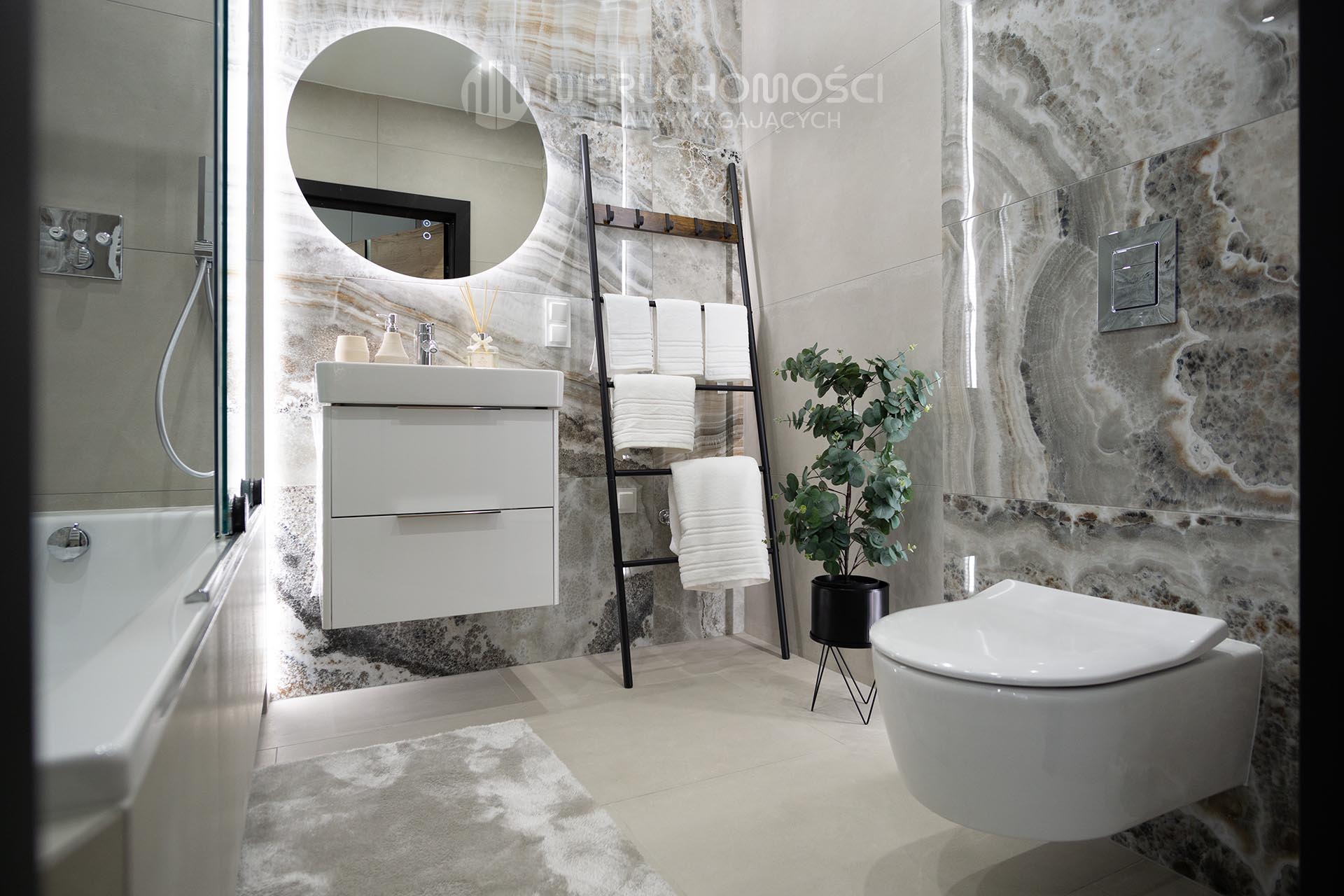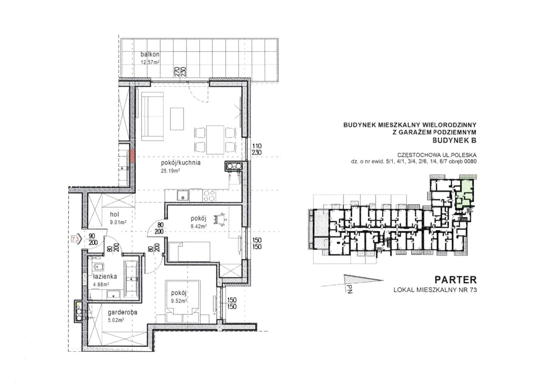 Mieszkanie nr 73 o powierzchni 62,94 m² z dużym balkonem, składa się z pokoju dziennego z aneksem kuchennym, sypialni z garderobą, pokoju, łazienki z WC. W przedpokoju znajduje się kolejna duża szafa w zabudowie. Mieszkanie z ekspozycją północno-zachodnią.