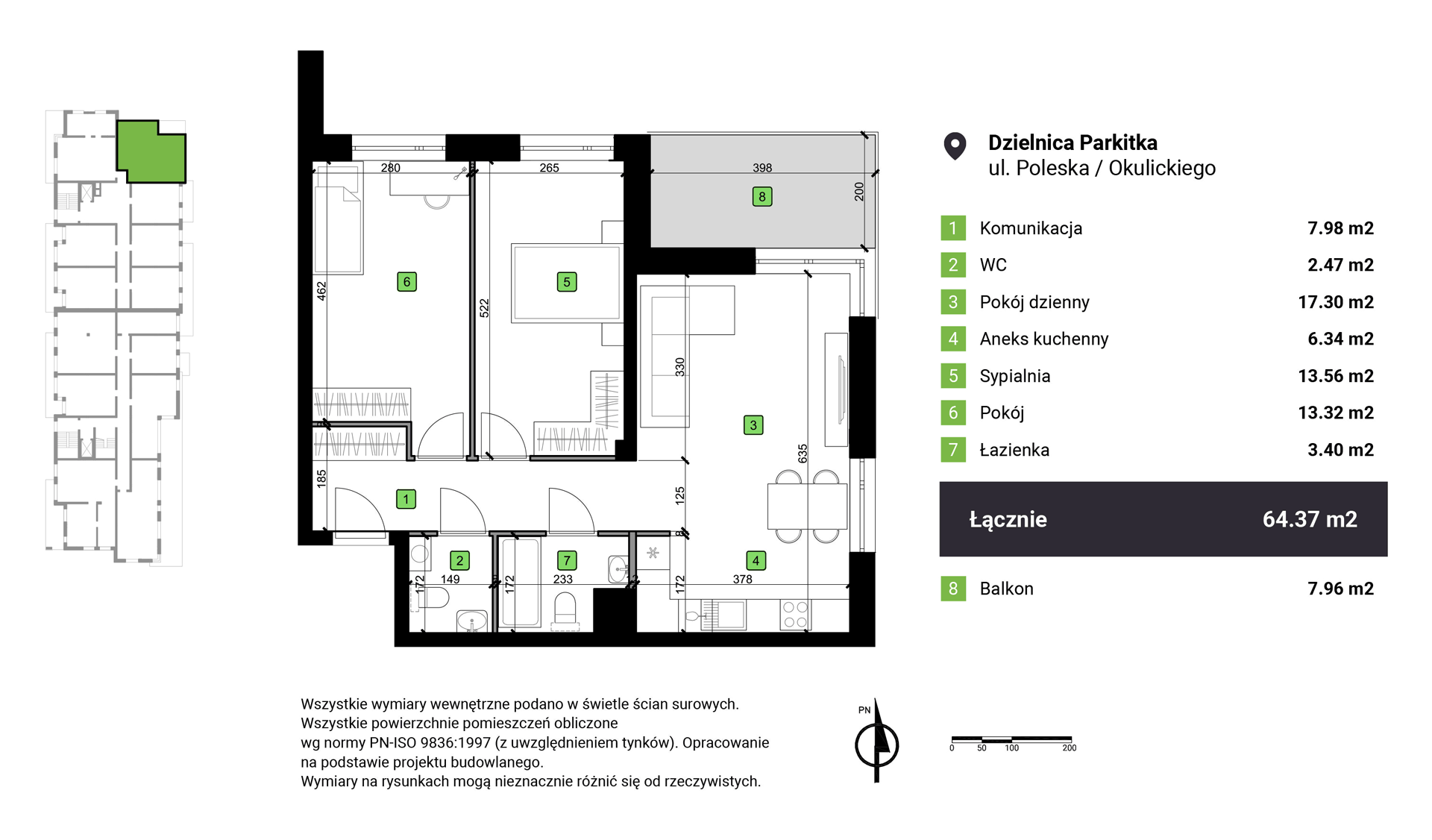 Mieszkanie nr 88 o powierzchni 64,37 m² z balkonem, składa się z pokoju dziennego z aneksem kuchennym, sypialni, pokoju, łazienki i WC. Mieszkanie z ekspozycją północno-wschodnią. Prezentowany lokal do świetna nieruchomość inwestycyjna, funkcjonalnie zaaranżowana przy użyciu materiałów wysokiej jakości a armatura pochodzi od renomowanych firm. Całości dopełniają unikatowe meble robione na wymiar z płyt EGGER, których matowa powierzchnia jest wolna od odcisków palców. Do mieszkania przynależy 1 miejsce postojowe dodatkowo płatne 20 000 PLN oraz 1 komórka lokatorska zawarta w cenie.
